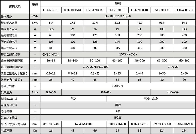 标配:三相380V,标配机用易快100精细割枪。含LGK-120IGBT电源1台,8m线缆直柄气冷切割枪1把,25平方mm接地电缆1根。